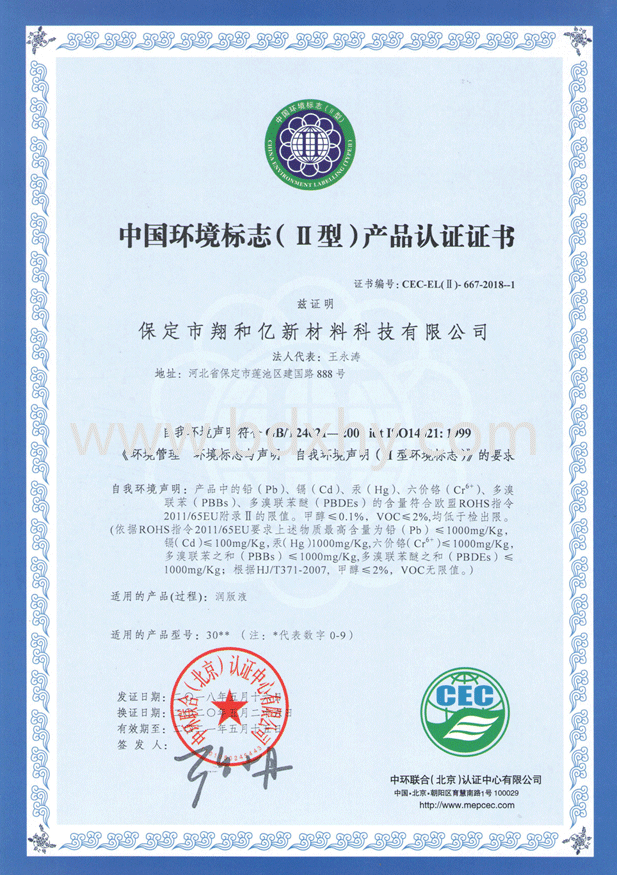 我公司于2018年5月通過中環(huán)聯(lián)合(北京)認(rèn)證中心對我公司嚴(yán)格審查,認(rèn)證通過并獲得《中國環(huán)境標(biāo)志(II型)產(chǎn)品認(rèn)證證書》—認(rèn)證產(chǎn)品名稱:潤版液,油墨清洗劑。